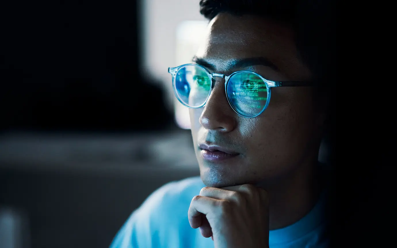 Nahaufnahme eines Mannes, Kinn auf Hand, dessen Computerbildschirm sich in seiner Brille spiegelt.