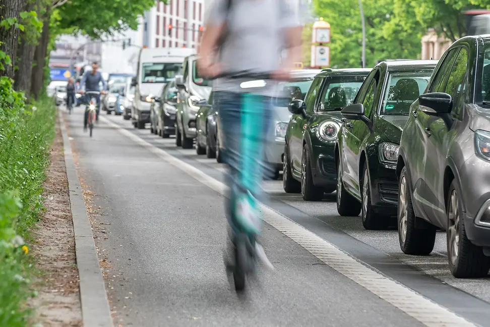 Eine Person fährt in einer Stadt auf einem Scooter an einer Reihe geparkter Autos vorbei.