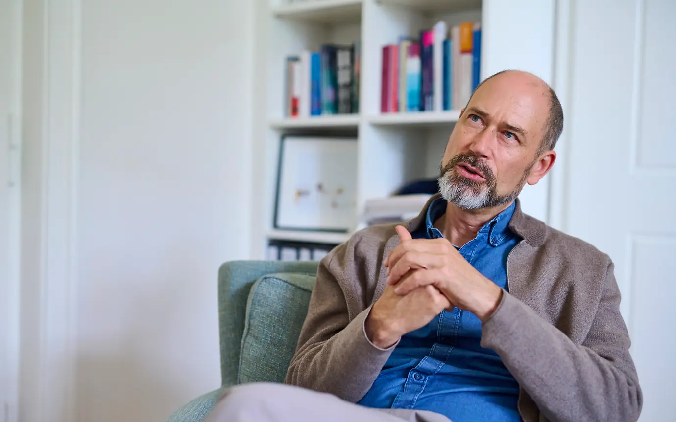 Ein Mann mittleren Alters mit Glatze und grauem Bart sitzt in einem Sessel vor einer hellen Wand mit einem Bücherregal.