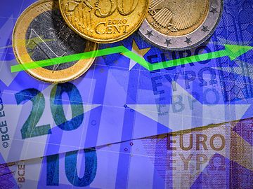 Euro-Banknoten und -Münzen im Licht einer Grafik