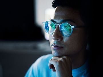 Nahaufnahme eines Mannes, Kinn auf Hand, dessen Computerbildschirm sich in seiner Brille spiegelt.