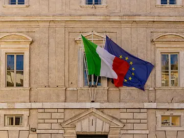 Ein altes Gebäude in Nahaufnahme mit der italienischen und der EU-Flagge.