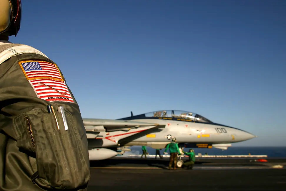 Ein Kampfflugzeug auf der Startbahn, über die Schulter eines Militärangehörigen gesehen.