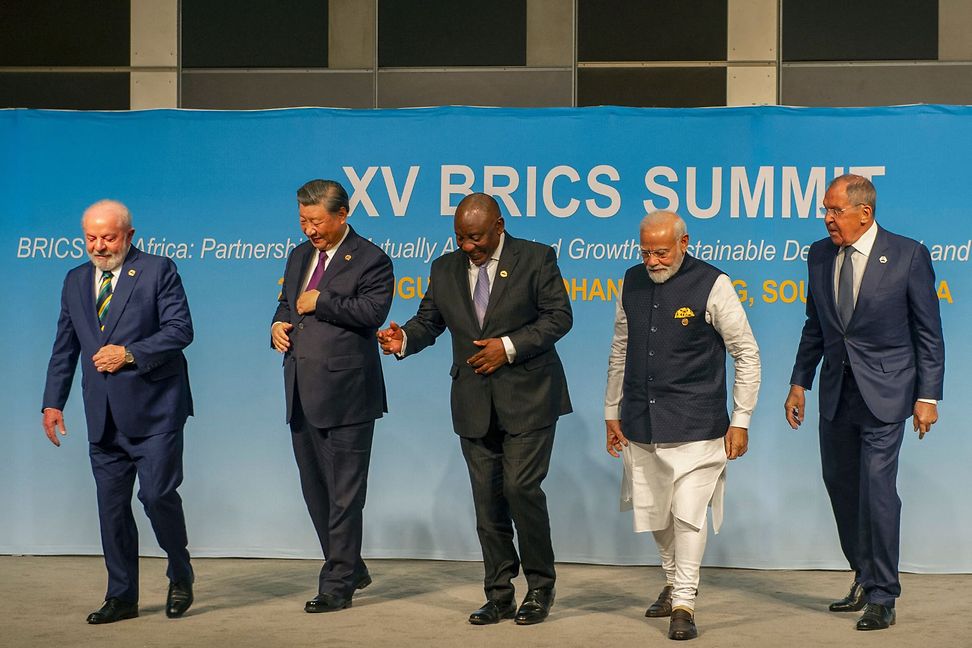 Selbst relativ grosse Schwellenländer wie einige der BRICS+ verfügen in der Regel nicht über gut entwickelte und offene Finanzmärkte (im Bild die Staatschefs Brasiliens, Chinas, Südafrika und Indiens sowie der Aussenminister von Russland). © Keystone/pool/Alet Pretorius