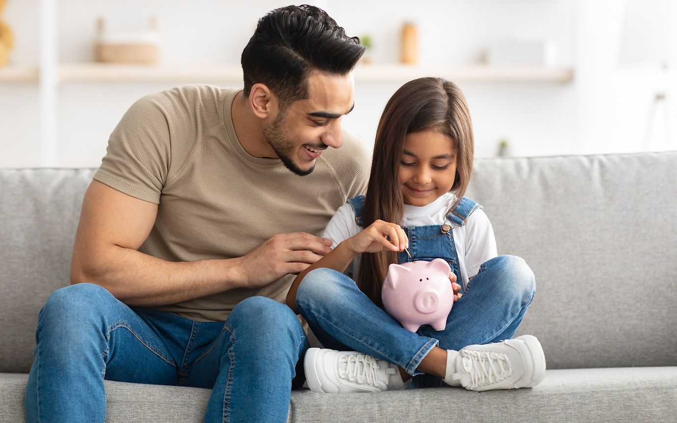 Ein Mann und ein Kind sitzen in einer häuslichen Umgebung auf einem Sofa und legen etwas in ein rosa Tonschwein.