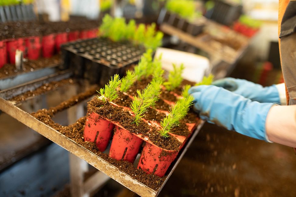 In einer Baumschule kümmert sich eine Person in Gartenarbeitskleidung um Tannensetzlinge.