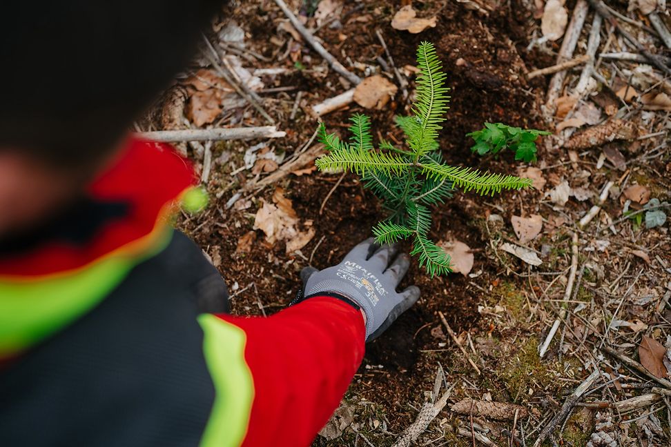 Eine Person pflanzt einen Tannensetzling in die Erde.