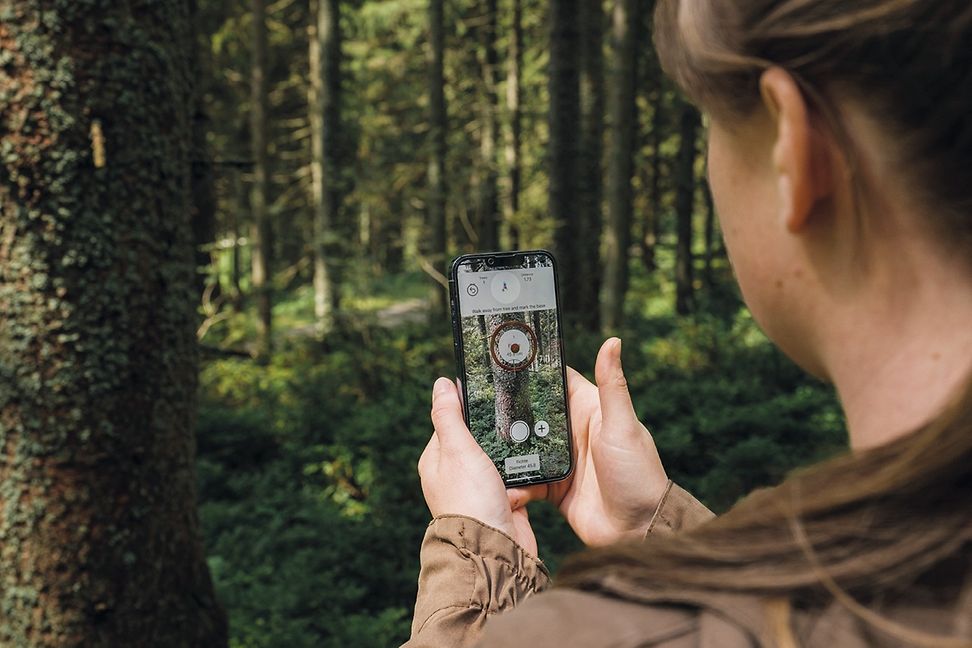 Eine Frau nimmt mit einem Smartphone Messungen im Wald vor.