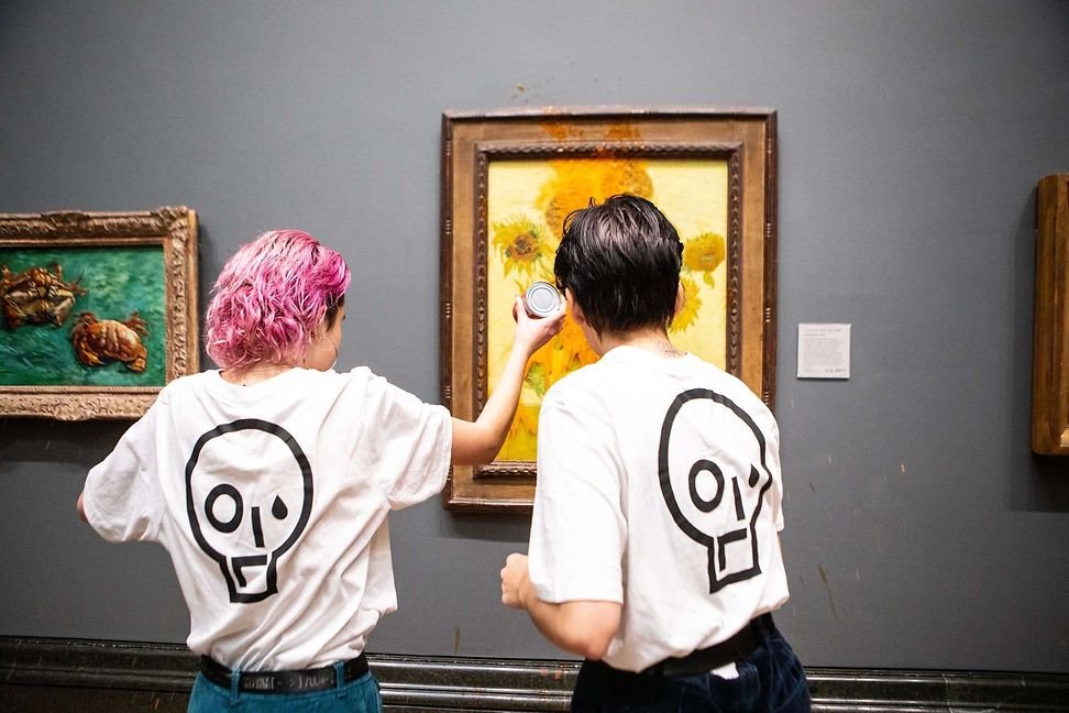Teil der ökologischen Klasse: Just Stop Oil Aktivistinnen werfen Tomatensauce auf Vincent van Goghs Sonnenblumen. © Antonio Olmos / Guardian / eyevine / laif