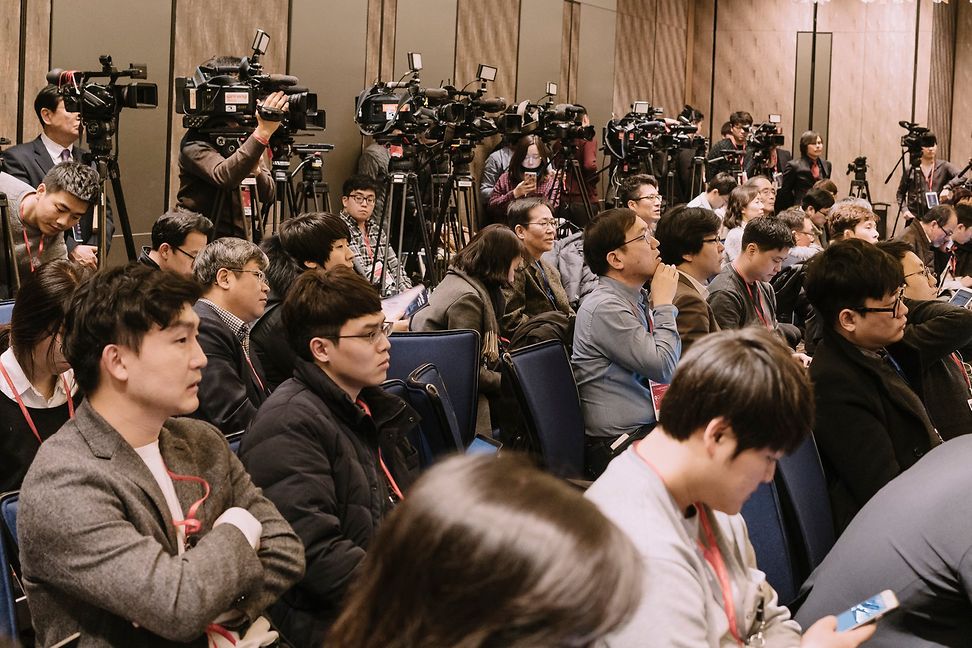 Die Öffentlichkeit hält den Atem an: Medienschaffende verfolgen den Go-Match des Jahrhunderts in Seoul live vor Ort. © Jun Michael Park/laif