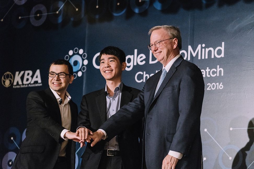 Demis Hassabis, Lee Sedol und Alphabet Chairman Eric Schmidt posieren vor dem Duell für ein Foto
