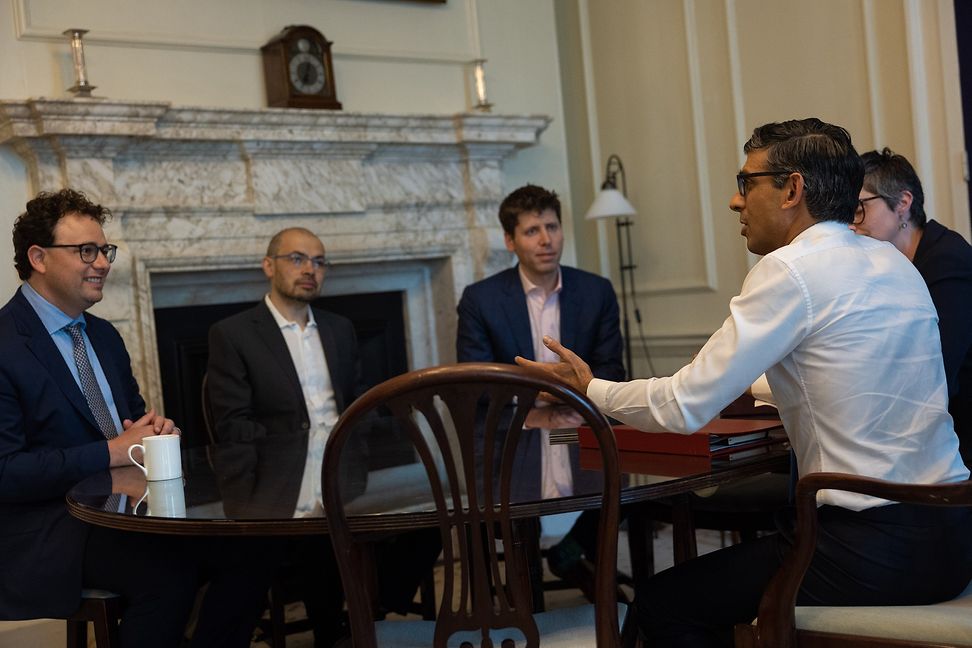 Hassabis engagiert sich auch politisch, wenn es um die Regulierung der KI geht. Hier mit dem britischen Premierminister Rishi Sunak sowie Dario Amodei, CEO von Anthropic, und Sam Altman, CEO von OpenAI, in der Downing Street 10. © KEYSTONE/AVALON/Simon Walker / Avalon