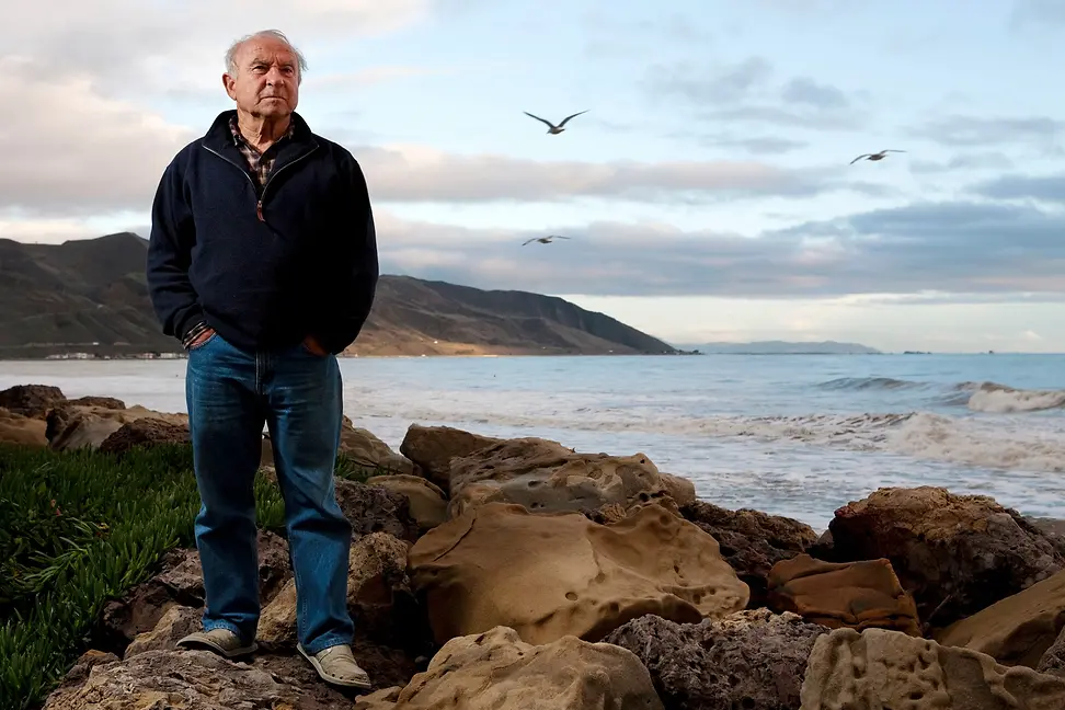 Der Outdoor-Enthusiast, Umweltschützer und Patagonia-Gründer Yvon Chouinard an einem felsigen Strand in seinem Haus in Ventura.