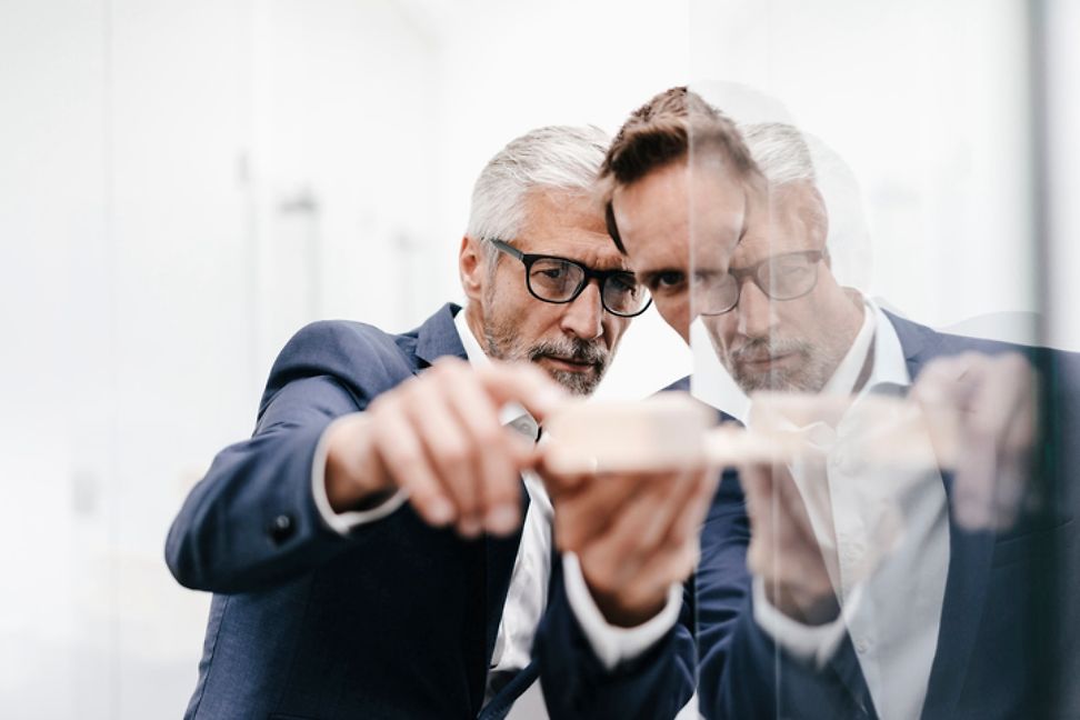 Zwei Männer in Anzügen betrachten gemeinsam einen Gegenstand, ein Herr spiegelt sich im Glas.