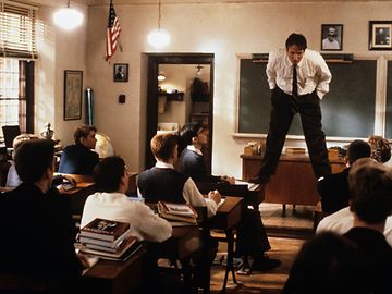 Ein Englischlehrer steht auf einem Pult in einem Klassenzimmer und spricht zu den Schülern, die zu ihm aufschauen.