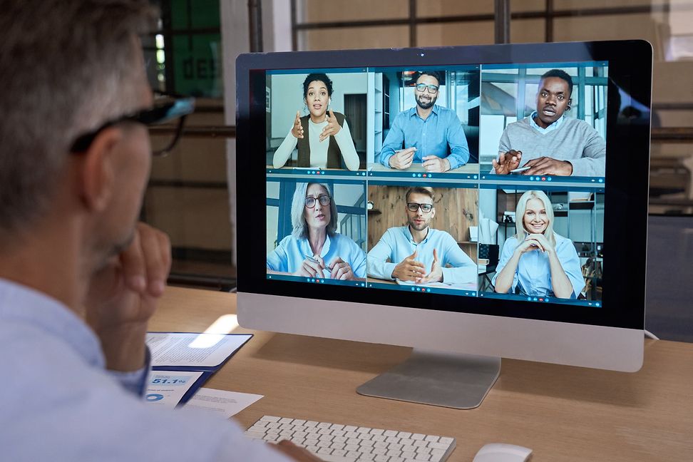 Männlicher Arbeitnehmer blickt, während eines Video-Meetings auf einen Bildschirm, der die Teilnehmer des Meetings zeigt