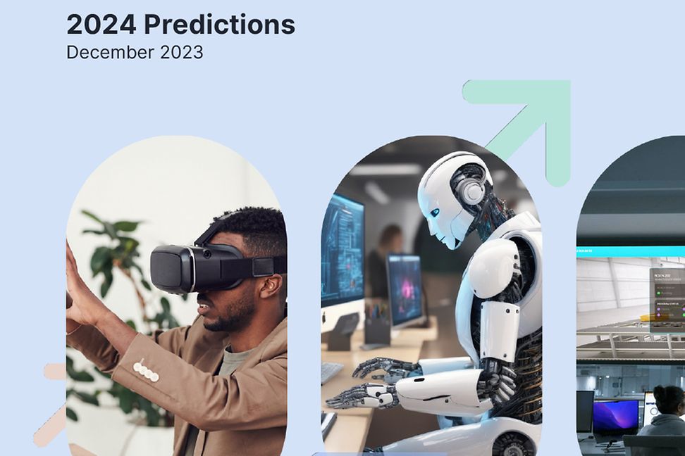 Hellblaues Deckblatt des Flex Reports, das in Bildausschnitten eine Person mit Cyberbrille und einen Roboter zeigt.