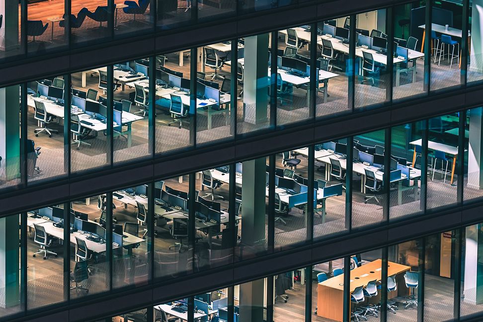 Modernes Glassfassaden-Bürohochhaus, in dem viele Schreibtische leer sind.