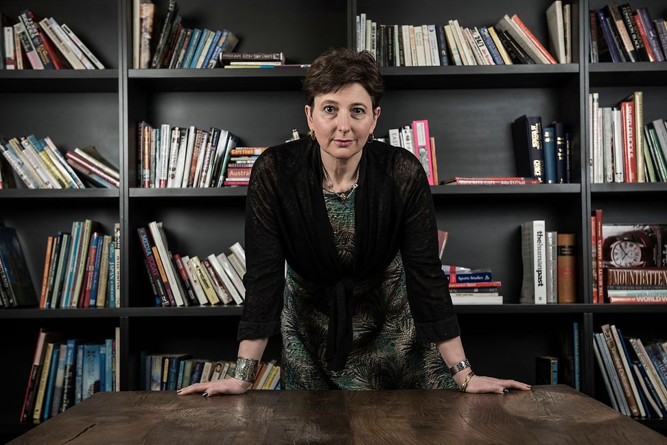 Die Futuristin und Autorin Julia Hobsbawm vor einem Bücherregal