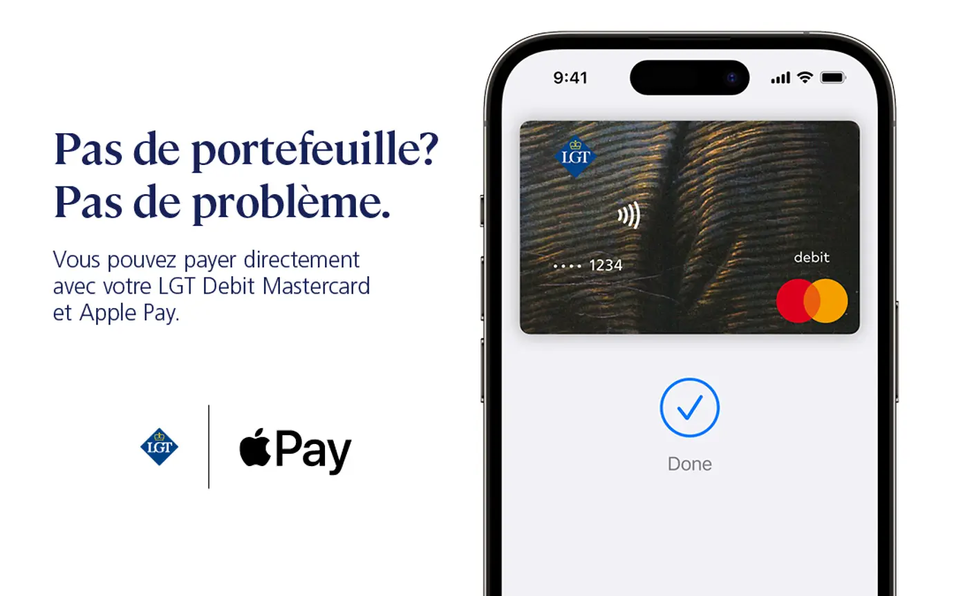 Apple Pay est un moyen simple, sûr et confidentiel de régler vos achats en magasin, en ligne et dans vos apps préférées. Maintenant disponible avec votre LGT Debit Mastercard sur vos iPhone, Apple Watch, iPad et Mac. Pour commencer, ouvrez l’app Cartes sur votre iPhone ou Apple Watch, ou sélectionnez Cartes et Apple Pay dans les Réglages de votre iPad ou les Préférences Système de votre Mac. Plus que quelques gestes et vous pourrez utiliser Apple Pay avec votre LGT Debit Mastercard.