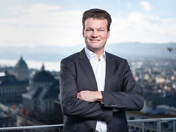 Reto Knutti, auf einer Terrasse stehend mit dem Zürichsee und der Universität im Hintergrund, blickt in die Kamera.