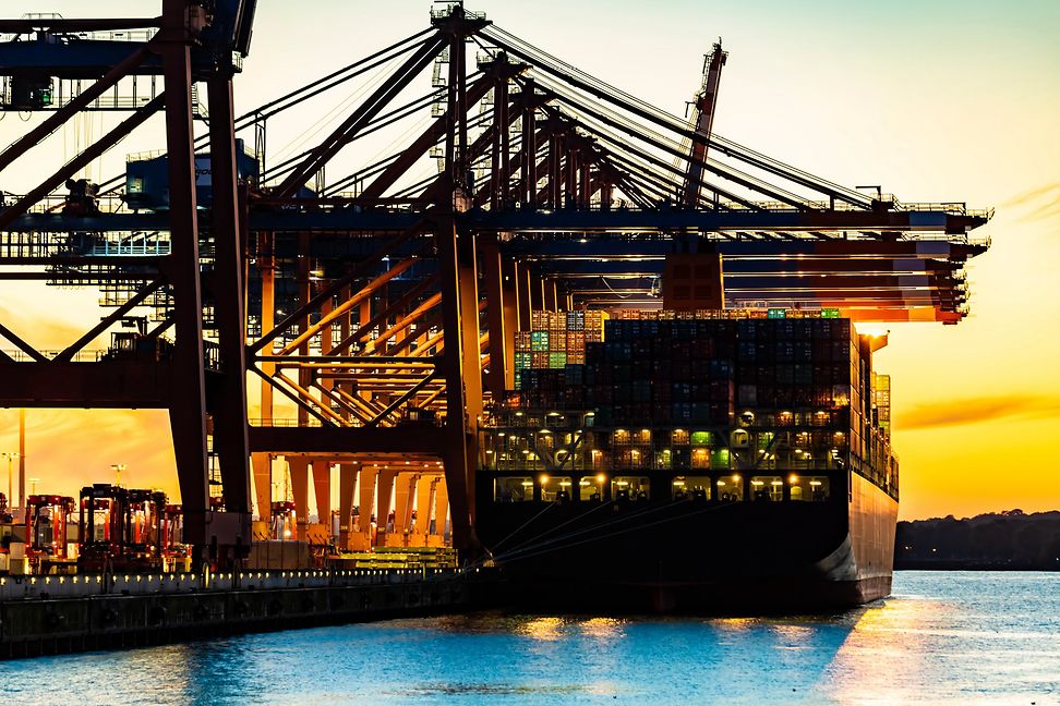 Ein Containerschiff im Hafen wird bei Sonnenuntergang beladen.
