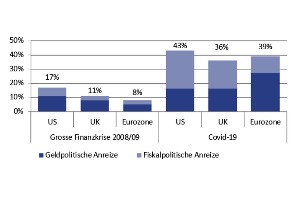 Beispiellose geld- und fiskalpolitischen Hilfsmassnahmen: seit dem Ausbruch der Corona-Pandemie wurden weltweit Hilfsmassnahmen von mehr als USD 30 Billionen ins Leben gerufen. In den USA betrug die geld- und fiskalpolitische Schützenhilfe 43% des Bruttoinlandprodukts, rund zweieinhalb Mal so viel wie während der grossen Finanzkrise 2008/09. In der Eurozone erreichte dieser Wert rund 39%, nahezu fünf Mal so viel wie in der grossen Finanzkrise (siehe Grafik 2). Der sonst äusserst liberale U.S. Arbeitsmarkt wurde mit derart grosszügigen Lohnausfallsentschädigungen aufgefangen, dass tiefere Einkommensschichten zeitweise mehr Entschädigungen als entfallene Lohnzahlungen erhielten.