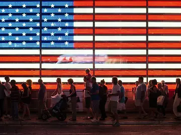 Eine Person betritt ein Haus mit einer grünen Tür, vor der ein Schild mit der Aufschrift "Vote here" und einer US-Flagge steht.