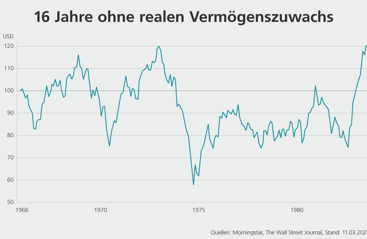 Von 1966 bis 1982 erzielten Anleger mit grossen US-Blue-Chip-Aktien unter Einbezug reinvestierter Dividenden und nach Bereinigung um die Inflation eine Nullrendite. Per 1974 hatten sie real betrachtet fast die Hälfte ihres Werts verloren.