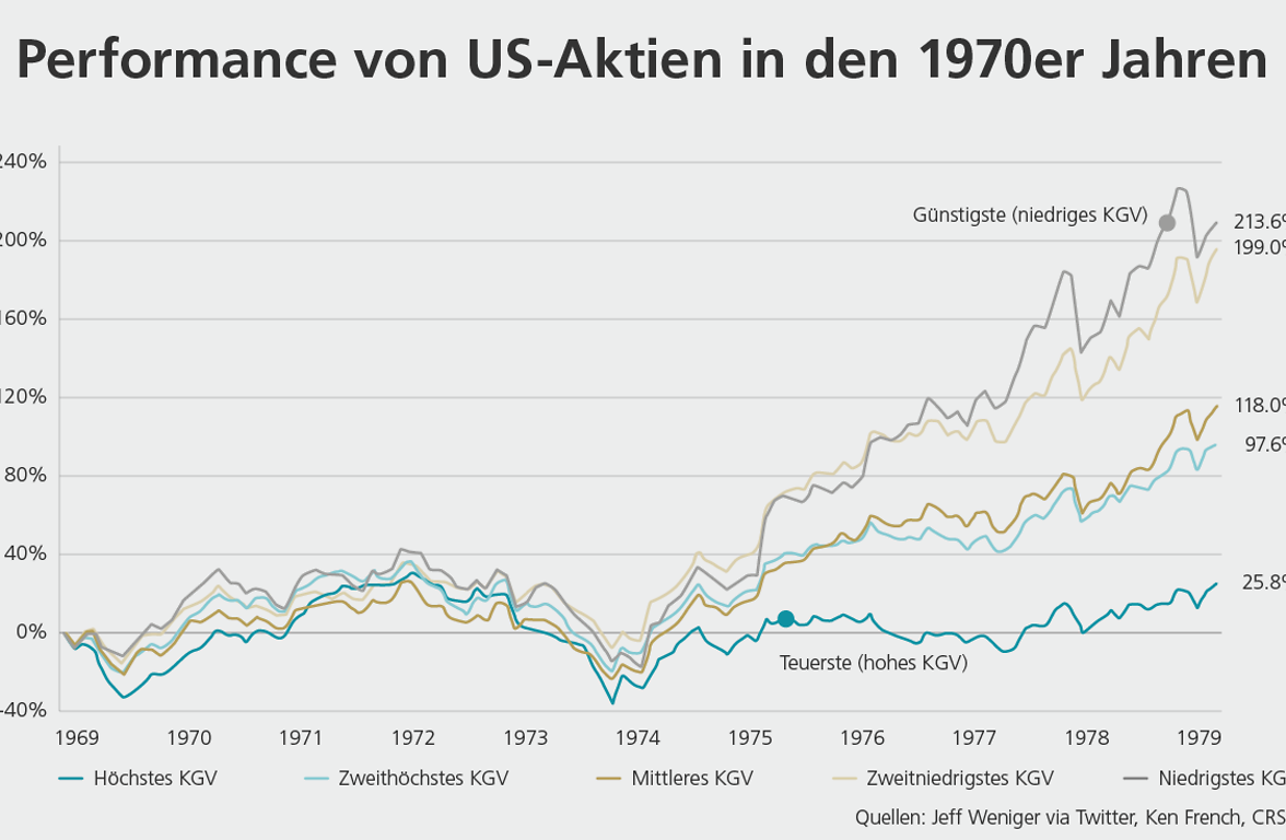 In den inflationären 1970er Jahren liefen die 20 Prozent der Aktien mit der niedrigsten Bewertung – gemessen anhand des Kurs-/Gewinn-Verhältnisses (KGV) – deutlich besser als die am höchsten bewerteten Aktien.