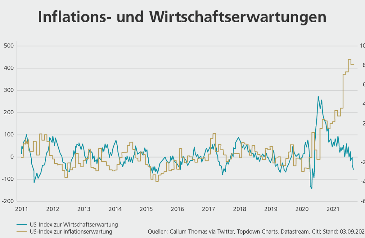 Inflationserwartungen hoch, Wirtschaftserwartungen runter: Im Herbst 2021 mehrten sich die Anzeichen dafür, dass eine erneute Stagflation bevorstehen könnte.