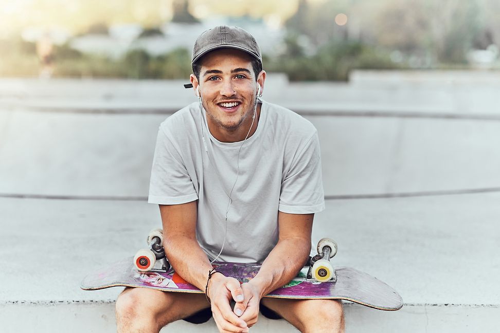 Ein junger Mann sitzt mit einem Skateboard auf dem Schoss und lächelt in die Kamera.