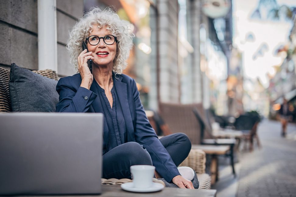 Eine Geschäftsfrau sitzt in einem Strassencafé und telefoniert.