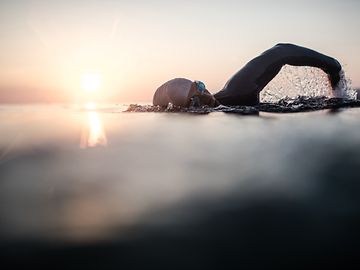 Eine Person, bekleidet mit Neopren, Badekappe und Schwimmbrille, schwimmt bei Sonnenaufgang im offenen Wasser