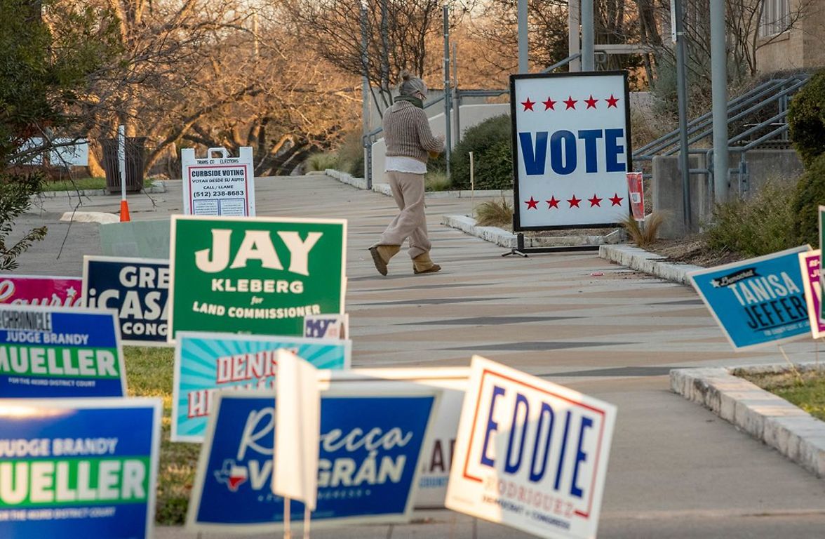 Wähler vor einem Wahllokal am Texas Primary Election Day am Dienstag, 1. März 2022 in Austin, Texas. © Jay Janner/Austin American-Statesman via AP