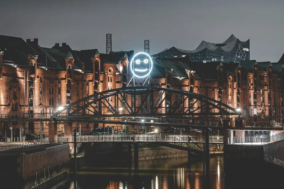 Die Kibbelstegbrücke in Hamburg am Hafen bei Nacht mit einem Neon-Smiley