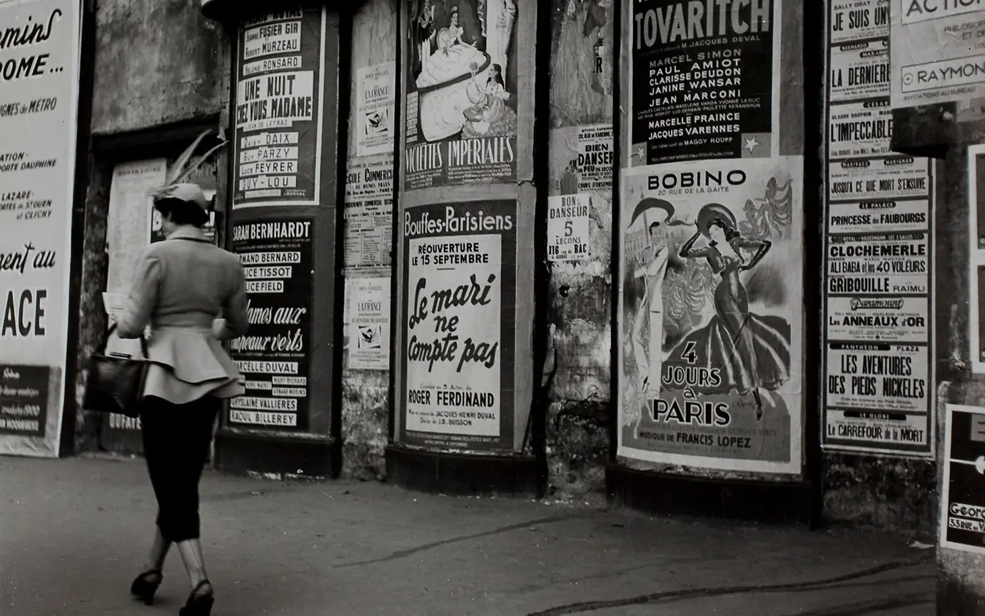 Schwarzweiss-Foto einer Frau vor einer Wand voller Posters in den 1950ern