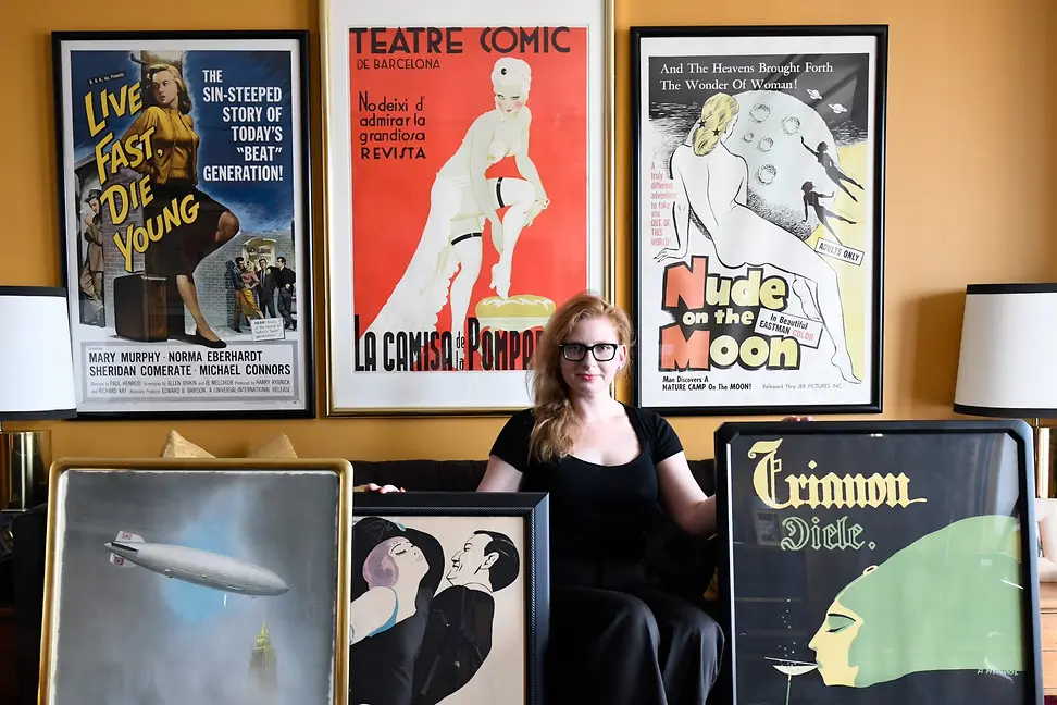 Angelina Lippert zwischen Vintage-Plakaten des Poster House