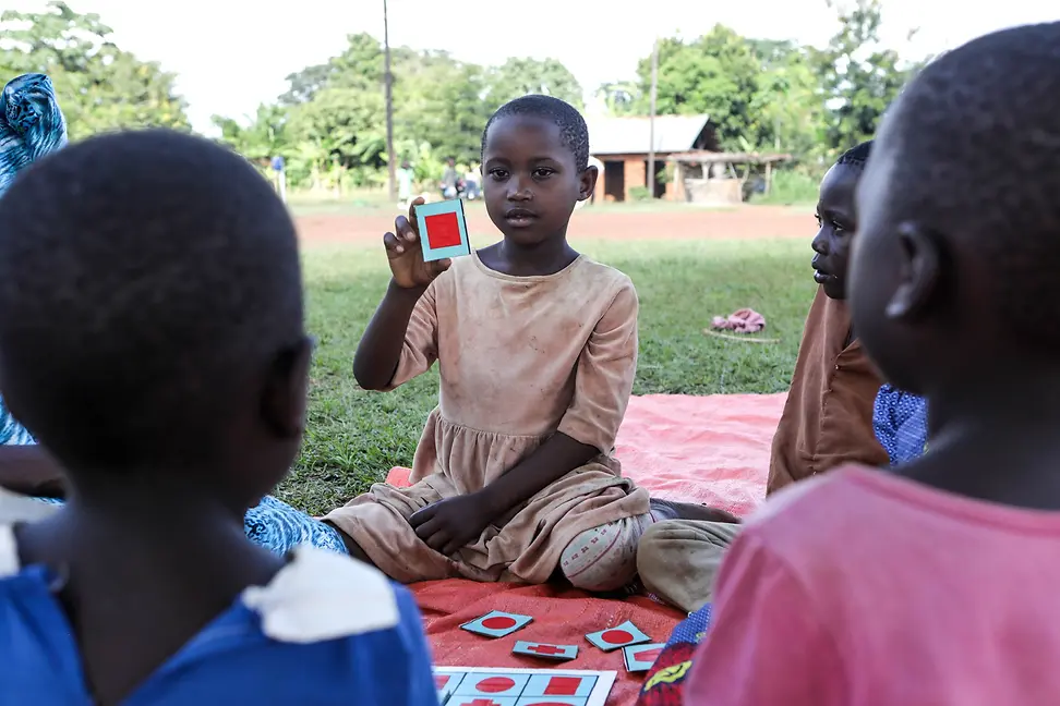 Und so werden an diesem Freitagnachmittag auf der orangenen Plane unter dem Mangobaum verschiedene Spiele ausgepackt: Bildermemory, Bücher zum Vorlesen, ein Spiel, um Zahlen zuzuordnen, geometrische Formen aus Holz. "Um die vielen Kinder gerecht zu betreuen, teilen wir sie in zwei Gruppen auf. Eine Gruppe startet mit den Indoor-Spielen, die andere Hälfte spielt Laufspiele - und nach einer Stunde wird getauscht", erklärt Lovisa Namusuubo.