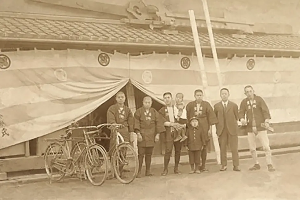Ein altes Sepia-Foto zeigt eine Gruppe asiatischer Männer mit zwei kleinen Kindern vor einem Gebäude mit asiatischem Dach