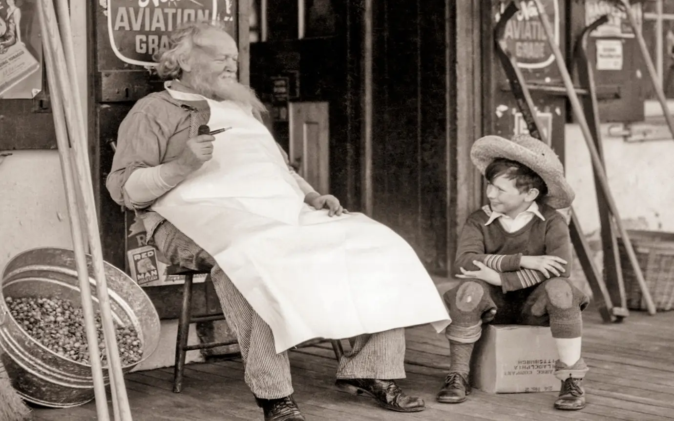 Ein älterer Mann mit Schürze sitzt auf einem Stuhl vor einem alten Lebensmittelgeschäft, neben ihm ein Kind auf einer Kiste.