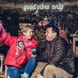 Eine Frau und ein Mann in Daunenjacken sitzen in einem Restaurant in einer Art Scheune. Sie wirken glücklich und vertraut.