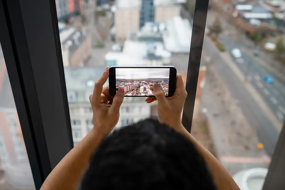 A young Caucasian man with a dark beard is standing on a rooftop terrasse fronting the camera.