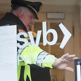 A police officer holds the door open for a customer at a branch of Silicon Valley Bank following the bank's collapse © Keystone/EPA/C.J. Gunther