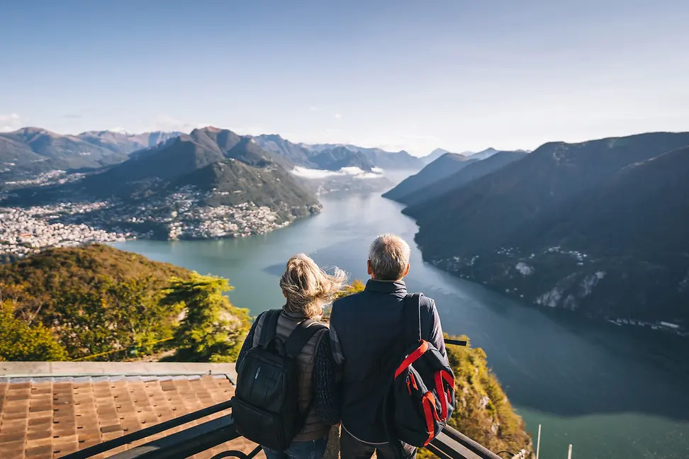 Two walkers, seen from the back, looking down from a hill onto a lake