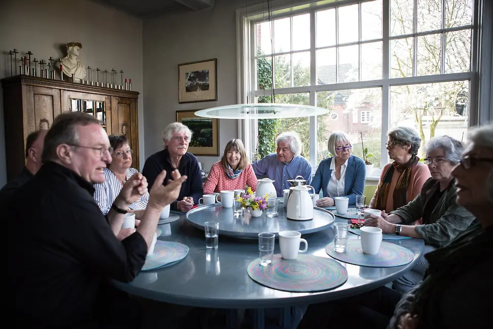 People in a domestic setting sitting around a table chatting over coffee and tea