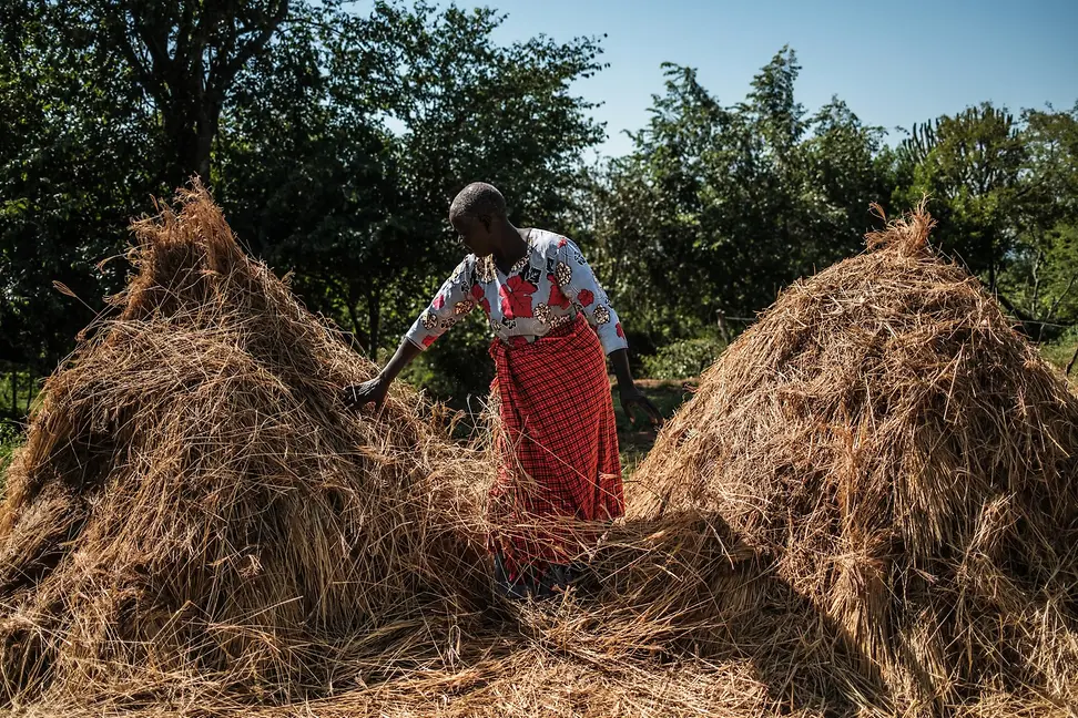 Nancy Kemboi kneels in the heavy, dark soil, bare hands gently prising loose the roots of a sweet potato. She lifts the thick, earth-caked tuber and drops it down beside her - it's at least 15 centimetres long. Gently parting the leaves, she digs deeper. The foliage is valuable feed for her animals. She pulls more and more sweet potatoes out of the ground.