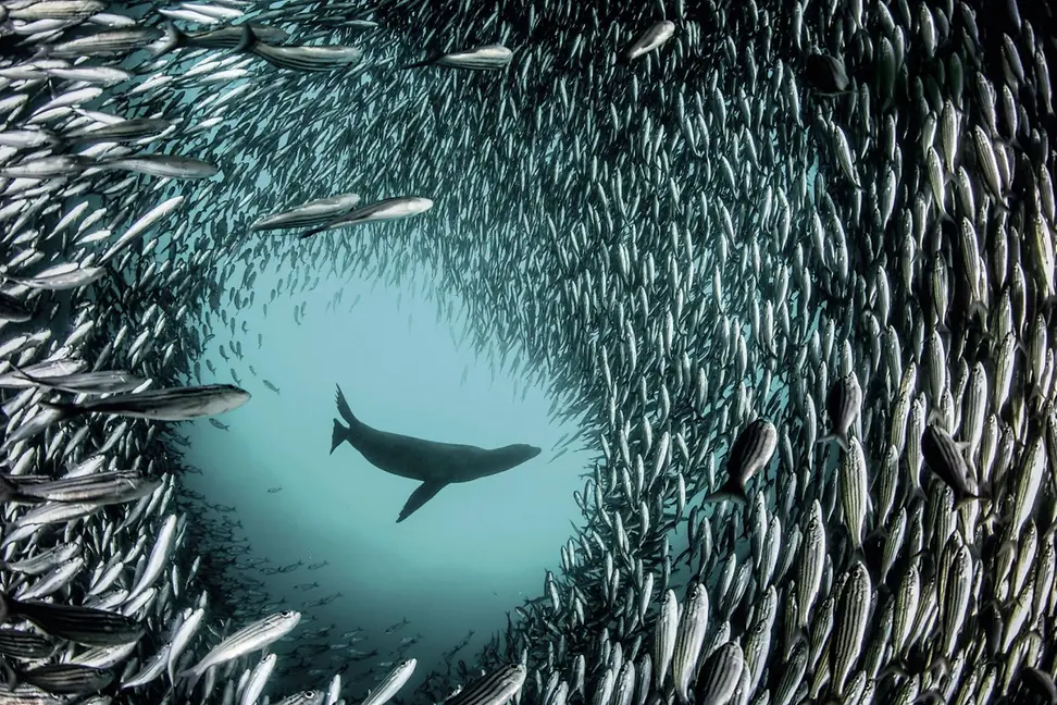 A Galápagos sea lion in the midst of a large school of fish in the ocean