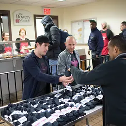 A person stands behind a table full of pairs of socks in a lounge and hands a pair to two other people.
