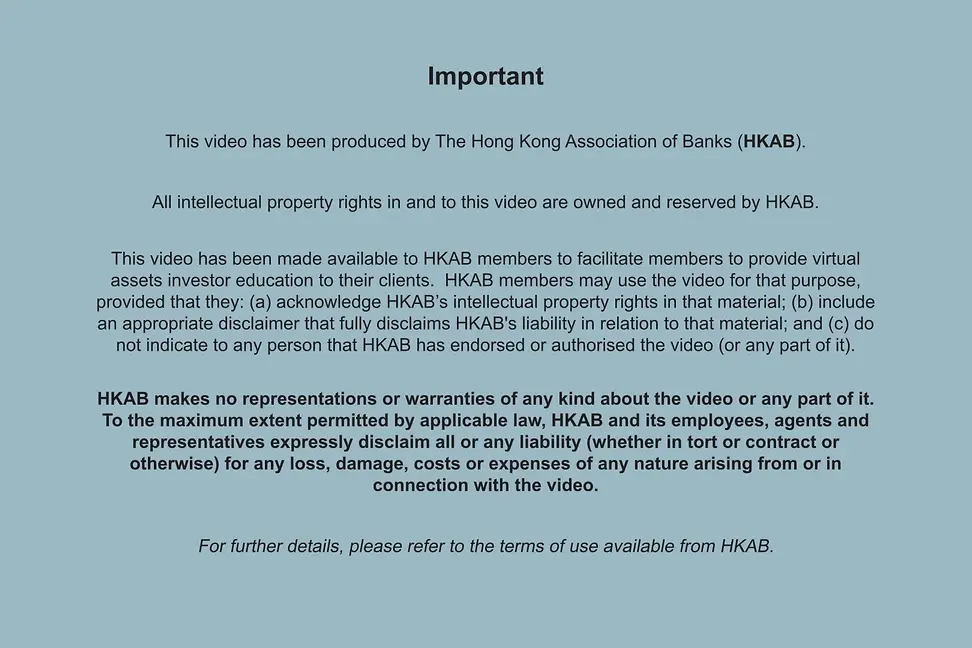 The virtual assets training video (“Video”) is being provided for general information purposes only and does not take into account the specific investment objectives, financial situation or particular needs or any particular person or class of persons, and has not been prepared for any particular person or class of persons. The Video also does not constitute investment advice, nor is to be construed as an offer, recommendation, or solicitation to enter into any transaction or to adopt any hedging or investment strategy, in respect of any virtual assets, virtual asset-related products, tokenised securities and other tokenised assets, securities, funds, structured products or any other financial instruments. The contents of the Video have not been reviewed by any regulatory authorities in any jurisdiction. If there is doubt about any of the contents of the Video, independent professional advice should be sought. LGT Bank AG, Hong Kong Branch and its associated/related entities (hereinafter severally and collectively “LGT”) accept no liability whatsoever for any direct or indirect consequential loss arising from or in connection with any use of, or reliance on, the information contained in the Video. In exchange for viewing the Video, you agree to hold LGT harmless against all and any claims for damages arising from any decision made based on the information contained in the Video. All intellectual property rights in and to the Video are owned by the Hong Kong Association of Banks (“HKAB”). You may not copy, distribute, modify, broadcast, hyperlink or transmit in any way all or any part of the Video in channels accessible to the public for any purpose whatsoever without HKAB’s prior written consent. To the maximum extent permitted by applicable law, HKAB and its employees, agents and representatives expressly disclaim all or any liability (whether in tort or contract or otherwise) for any loss, damage, costs or expenses of any nature arising from or in connection with the Video.